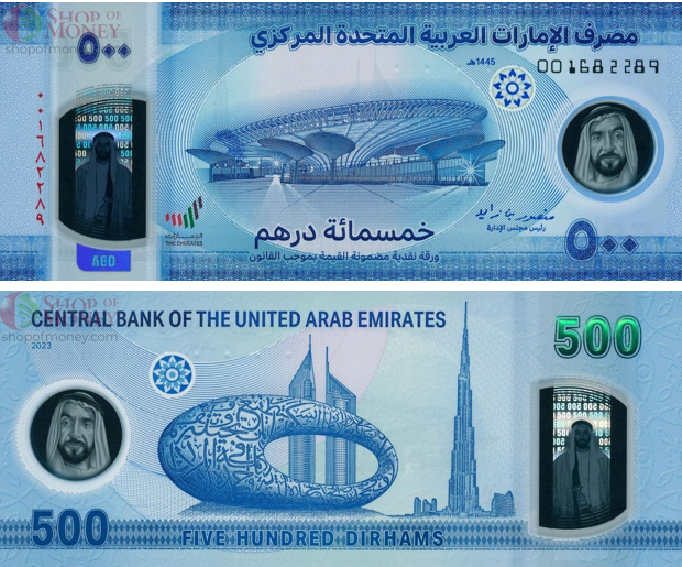 Полимерная банкнота 500 дирхамов 2023 года представляет новое поколение денежной серии ОАЭ, посвящённой инновациям, устойчивому развитию и современным достижениям страны.