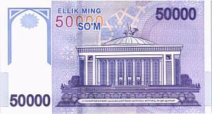 В том же году, что и предыдущая, была разработана, составлена и отпечатана пятидесятитысячная банкнота, оформленная в богатые фиолетово-синие цвета. На титульной стороне красуется главная площадь столицы – Мустакиллик (Независимости), с имеющимся на ней монументом Эзгулик аркаси в виде арки, с возносящимися кверху аистами, как символ благородных устремлений.