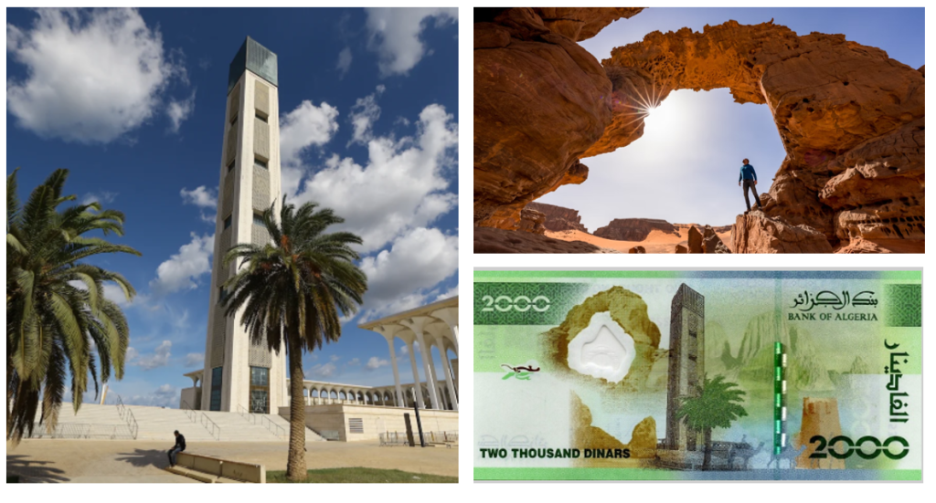 На обороте виден природный памятник каменная арка в национальном парке Tassili n’Ajjer, одном из самых живописных уголков Сахары.