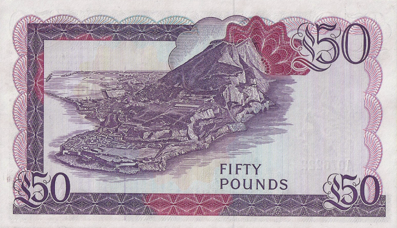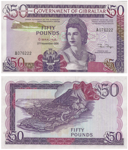 В 1986 году Правительство Гибралтара выпустило редкую и престижную банкноту номиналом 50 фунтов стерлингов - одну из наиболее высоких купюр в денежном обращении заморской территории Великобритании.Лицевая сторона банкноты 50 фунтов Гибралтара 1986