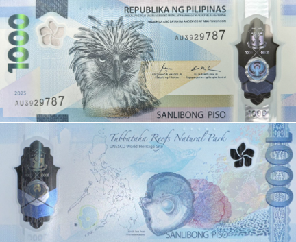 Центральный банк Филиппин подтвердил новую дату 2025 на купюре номиналом 1,000 песо. Этот выпуск сохраняет дизайн, введённый в обращение в 2022 году: на аверсе изображён филиппинский орёл, символ природного наследия страны, а на реверсе рекреационный парк Tubbataha Reefs Natural Park, объект ЮНЕСКО.