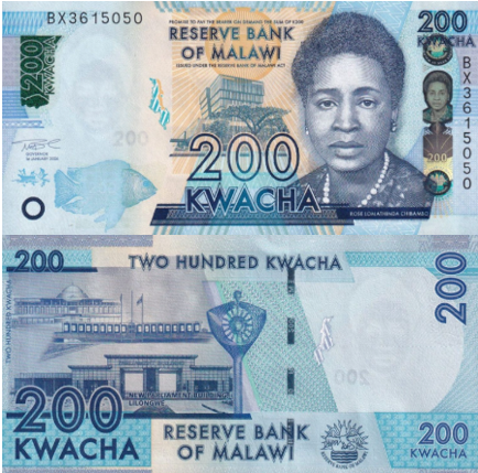 Банк Малави выпустил обновлённую купюру 200 квача с новой датой 1 января 2024 года. Дизайн полностью повторяет предыдущий тип, на котором изображена Роуз Чибамбо, участница борьбы за независимость страны.
