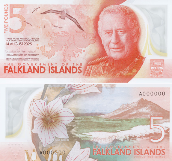 Фолклендские острова переходят на полимер. 14 августа 2025 года в честь Дня Фолклендов будет выпущена новая серия банкнот номиналом 5, 10 и 20 фунтов. Это первое обновление дизайна за более чем 40 лет.