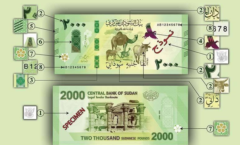 Банкнота номиналом 2 000 SDG, датированная июнем 2025 года, является самым крупным денежным знаком в истории Судана. Её дизайн выполнен в современном стиле с применением водяных знаков, голографических нитей и других элементов защиты.