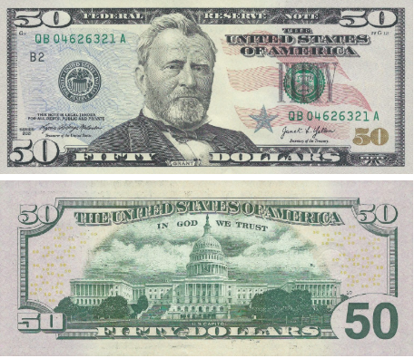 Federal Reserve Note номиналом 50 долларов с новыми подписями Malerba / Yellen.