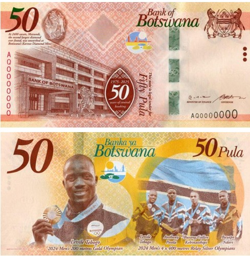 С 6 февраля 2026 года Bank of Botswana вводит в обращение памятную банкноту номиналом 50 пула, анонсированную в сентябре 2025 года президентом Duma Gideon Boko. Выпуск приурочен к 75-летию Банка Ботсваны и одновременно посвящён успехам страны на Олимпийских играх 2024 года в Париже.