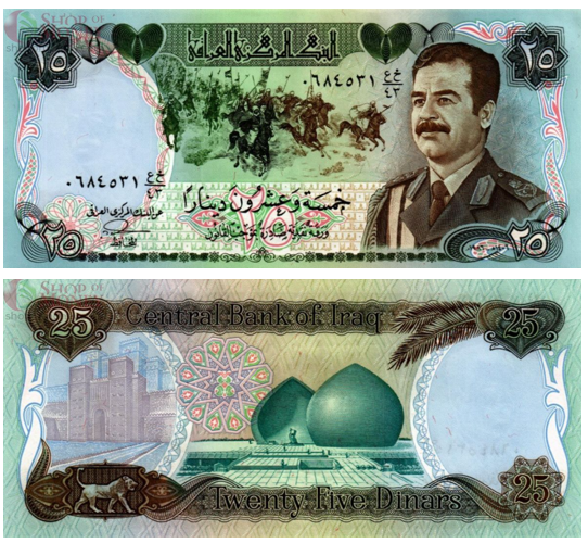 Впервые портрет Саддама Хусейна появился на банкноте номиналом 25 иракских динаров в 1986 году, в составе так называемой «швейцарской серии». Лицевая сторона банкноты изображает всадника с мечом, копьями и знамёнами — символ национального духа. На обороте — знаменитый Мемориал шахидов (al-Shaheed), посвящённый павшим в ирано-иракской войне, начатой Саддамом.