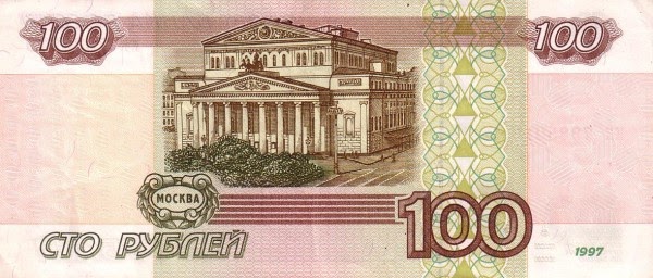 Тыльная сторона купюры 100 руб, фото которой рассказывает свою историю, украшена нарисованными фасадом Большого театра. Справа от картинки нанесен орнамент из тонких зеленых и желтых полос. Слева под зданием изображена эмблема, внутри которой указано название города – Москва. Числа прописаны так же, как и на лицевой стороне.