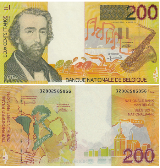 Банкнота номиналом 200 франков 1995 года с Адольфом Саксом выпускалась с 1996 года до перехода Бельгии на евро.Представляет интерес для коллекционеров как часть серии с выдающимися бельгийцами.