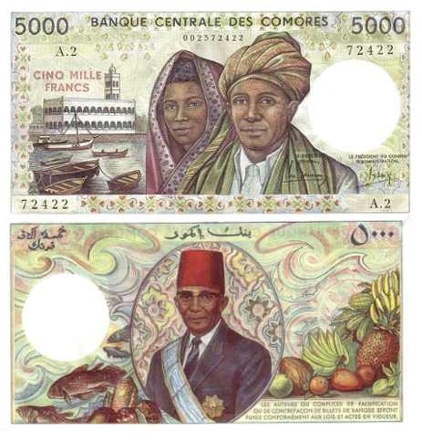 Банкнота 5000 франков Коморских островов представляет интерес для коллекционеров благодаря выразительному дизайну, жанровым сценам и принадлежности к валютам стран Индийского океана. Она хорошо вписывается в тематические коллекции, посвящённые африканским банкнотам второй половины XX века и национальным денежным выпускам островных государств.Заключение