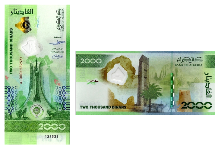 На банкноте изображён знаменитый Sanctuaire des Martyrs Мемориал мучеников в Алжире, символ борьбы страны за независимость.