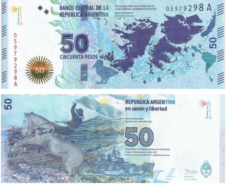 Примечание: Банкнота выпущена в 2015 году и посвящена аргентинским притязаниям на Мальвинские острова