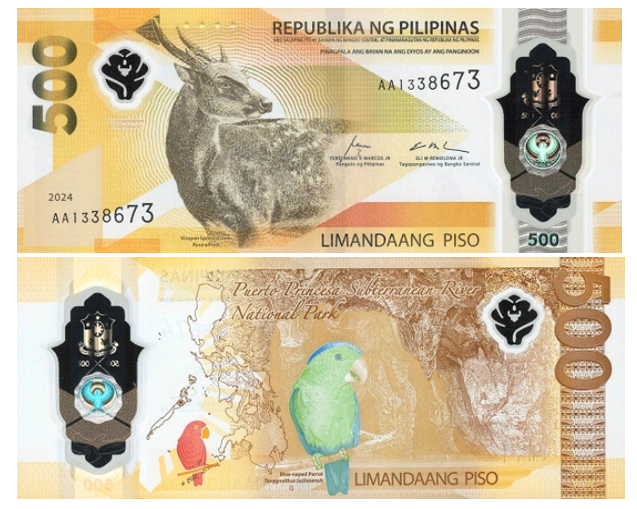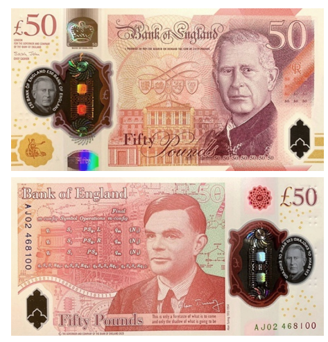 • Изображение голубого марлина, дельфинов и тунца, что отражает морскую культуру острова.• Портрет нового монарха Короля Чарльза III.