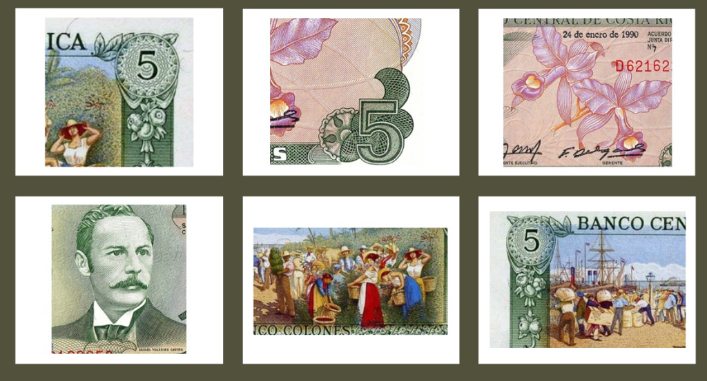 Эта банкнота представляет собой интереснейший нумизматический артефакт: сочетание исторического портрета, национальных символов (орхидея Guaria Morada), культурного полотна и разнообразных серий с подписями и датами.