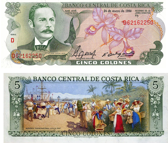 Банкнота номиналом 5 колонов была выпущена Banco Central de Costa Rica в Коста-Рике в период 1968–1992 годов. На её аверсе изображён портрет бывшего президента Коста-Рики Рафаэль Иглесиас Кастро (Rafael Yglesias Castro), а на реверсе - аллегорическая сценa, основанная на произведении художника Aleardo Villa (или «J. Villa») 1897 года.