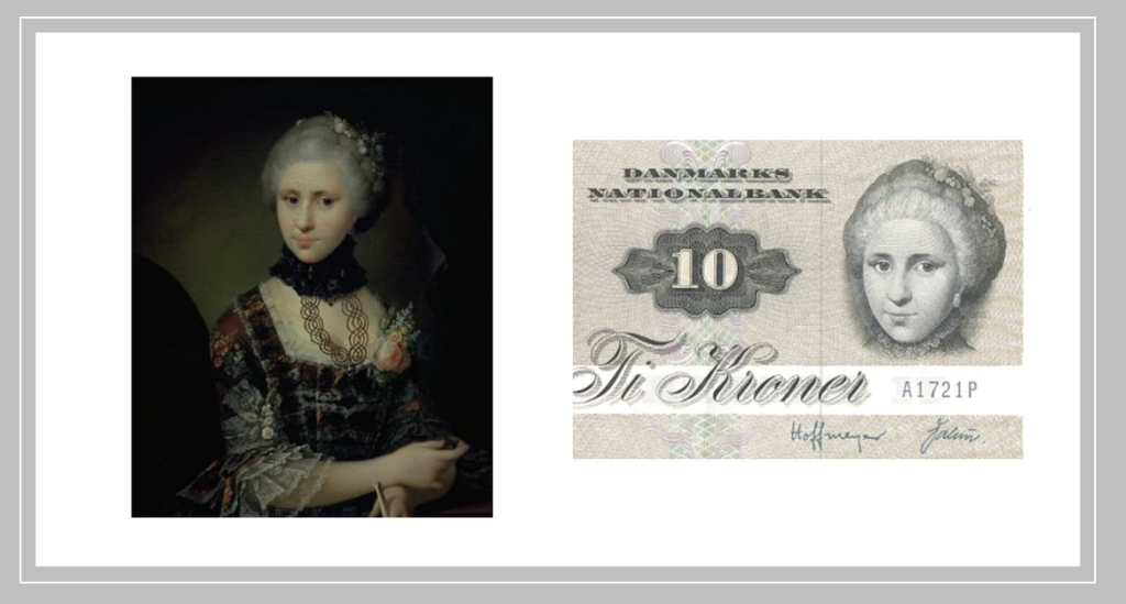 На лицевой стороне изящный портрет Катрин Софии Кирхгоф, датской дворянки, написанной Юэлем. Её спокойный взгляд и причёска в стиле эпохи Просвещения символизируют женственность и достоинство.