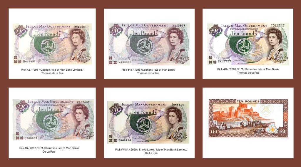 Банкноты Острова Мэн формируют целостную и устойчивую систему обращения с начала 1990-х годов. Их оформление отличается стабильностью: на протяжении более двух десятилетий сохранялся единый визуальный стиль с портретом королевы Елизаветы II, символом трискелиона и изображениями ключевых объектов острова, таких как Tynwald Hill, замок Рашен и колесо Лакси.