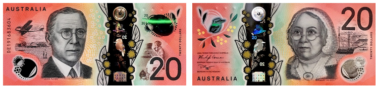 На лицевой стороне банкноты изображена Мэри Рейби — купец, судовладелица и торговец английского происхождения. Будучи сосланной в Австралию в качестве каторжницы, она сумела построить успешный бизнес и стала примером для подражания в обществе. На фоне — парусник «Меркурий».