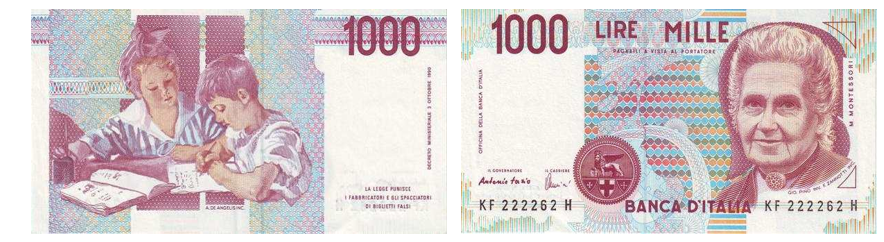 Оборот банкноты украшен изображением школы, основанной по её методике.