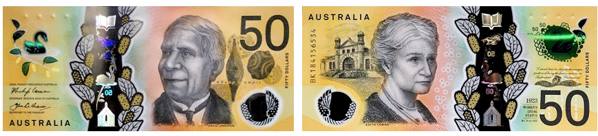 На обратной стороне — Дэвид Юнайпон, первый австралийский абориген, опубликовавший научные труды, изобретатель и писатель.
