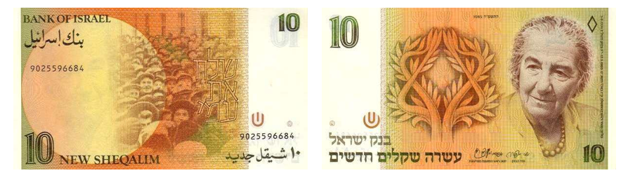 На обороте банкноты — сцена её выступления перед еврейской общиной в московской синагоге во времена её работы послом в СССР. Надпись на иврите: «Отпустите мой народ».