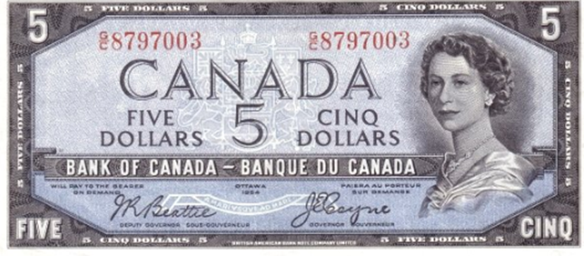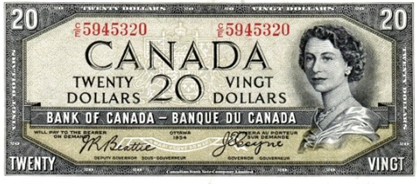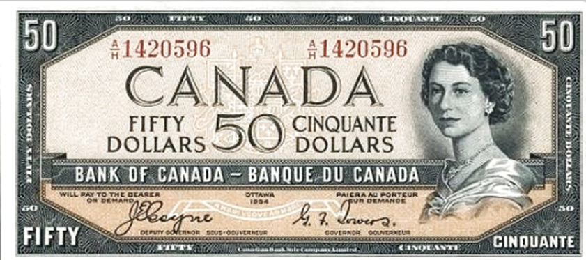 Банкнота была выпущена Банком Канады в 1954 году вскоре после начала правления королевы Елизаветы II. На банкноте изображён портрет молодой королевы, выполненный на основе фотографии Дороти Уайлдинг. За гравировку отвечал Джордж Гундерсон из British American Bank Note Company. Целью было создание элегантного и торжественного изображения, но непреднамеренный эффект в виде «дьявольского лица» вызвал недоумение у общественности.
