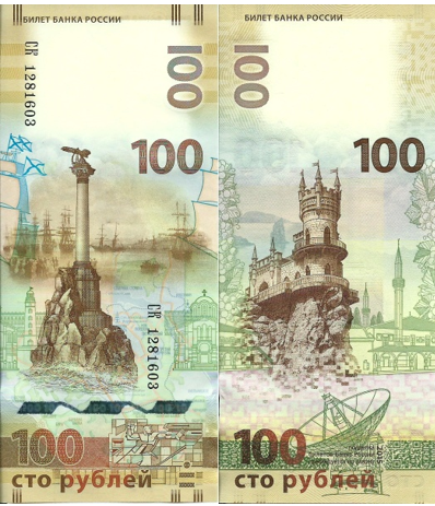 В конце 2015 года Центробанк напечатал 100-рублевую банкноту, одна сторона которой отведена Севастополю, а другая — природе и культурным памятникам Крыма. Как и на выпущенной двумя годами ранее олимпийской сторублевке, изображения на новой купюре располагаются вертикально. Тираж «крымских» банкнот составил 20 миллионов экземпляров.