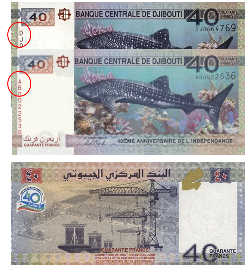 В честь 40-летия независимости Центральный банк Джибути выпустил памятную банкноту номиналом 40 франков. Это официальное платёжное средство, но оно не поступало в широкое обращение. Выпуск носил юбилейный и коллекционный характер.