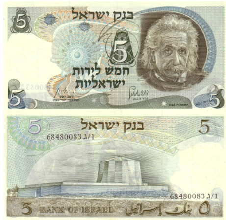 В 1968 году Банк Израиля выпустил банкноту номиналом 5 лир с портретом Эйнштейна. Это была дань уважения учёному, сыгравшему важную роль в развитии мировой науки и поддержавшему Израиль как государство.ç