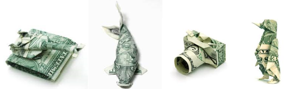 Японский мастер оригами Вон Парк складывает из настоящих долларов и евро миниатюрные произведения: от карпа кои до мебели и зданий. Его работы создаются в строгом соответствии с канонами классического оригами, и он даже опубликовал книгу "Origami from Dollar Bills: 10 Amazing Projects".