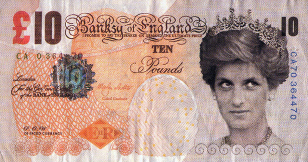 Ещё в 2004 году Бэнкси создал фальшивую купюру в 10 фунтов стерлингов, на которой вместо королевы Елизаветы II изображена принцесса Диана, а подпись «Bank of England» заменена на «Banksy of England». Он напечатал 100 000 таких купюр и планировал устроить перформанс, разбрасывая их с крыши здания. Сегодня каждая из них — ценный арт-объект. На eBay их стоимость варьируется от £1,99 до £750, а одна из купюр даже попала в коллекцию Британского музея.
