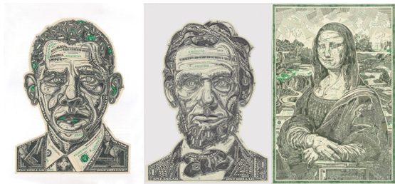 Американец Марк Вагнер делает сложнейшие коллажи исключительно из однодолларовых купюр. Его работы включают портреты президентов, мировых лидеров и даже репродукции таких шедевров, как Мона Лиза. Одна из самых масштабных работ — 5-метровая Статуя Свободы из тысячи купюр. Его коллажи представлены в библиотеках Конгресса и Нью-Йорка, MoMA в Сан-Франциско и других учреждениях.