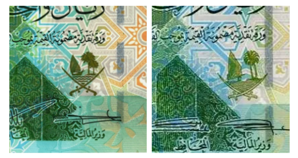 Стало (с 2025 года): На новой банкноте размещена обновлённая государственная эмблема Катара, утверждённая в 2022 году. Сохранив основные символы — парусник, мечи и пальмы, — дизайнеры сделали композицию более лаконичной: линии стали тоньше, фон чище, а визуальный стиль современным и минималистичным.