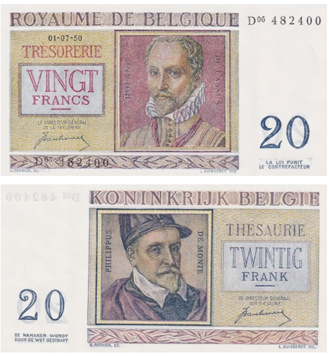 На ранних банкнотах изображены два выдающихся фламандских композитора эпохи Ренессанса - Роланд де Лассюс на лицевой стороне и Филипп де Монте на обороте. Филипп де Монте - фламандский композитор эпохи Ренессанса (1521–1603), один из крупнейших мастеров европейской полифонии и автор более 1200 вокальных произведений. Это классическая, строгая серия в бордово-фиолетовой гамме.