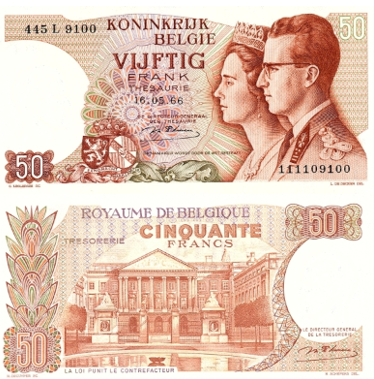 Последняя казначейская банкнота Бельгии и одно из самых узнаваемых изделий Trésorerie. На лицевой стороне - портреты короля Бодуэна I и королевы Фабьолы, выполненные в красно-коричневой гамме. На обороте изображено здание бельгийского парламента.
