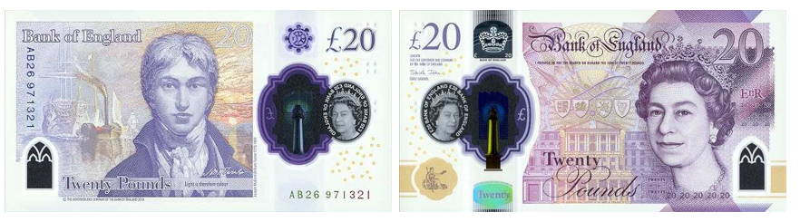 Банкнота: 20 фунтов, 2018–2023 гг.,P-W396 — с портретом Елизаветы II