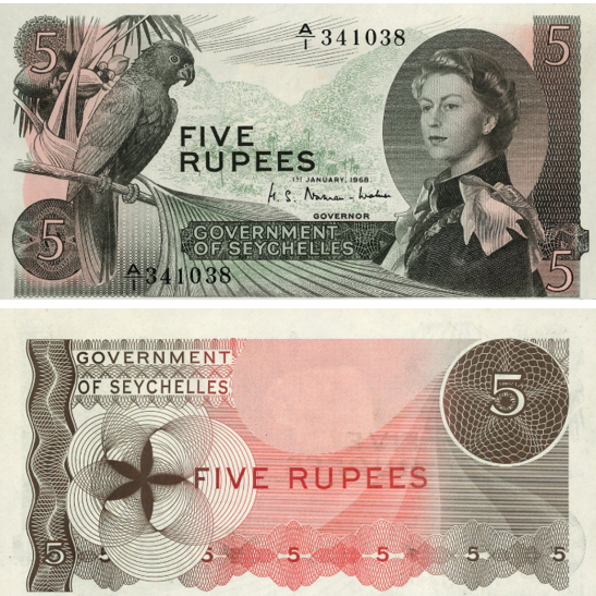 | 5 Rupees | 1968 | Hugh Selby Norman-Walker | Черный попугай Сейшел (Seychelles Black Parrot) | Pick 14 |