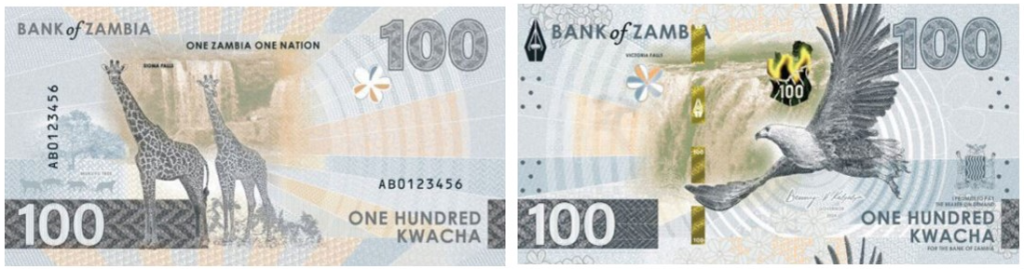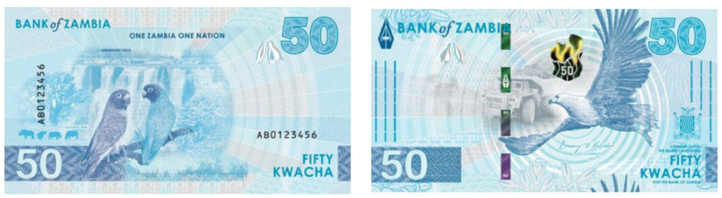 Оборотная сторона каждой банкноты демонстрирует один из водопадов Замбии, а также эндемичных животных и растения.