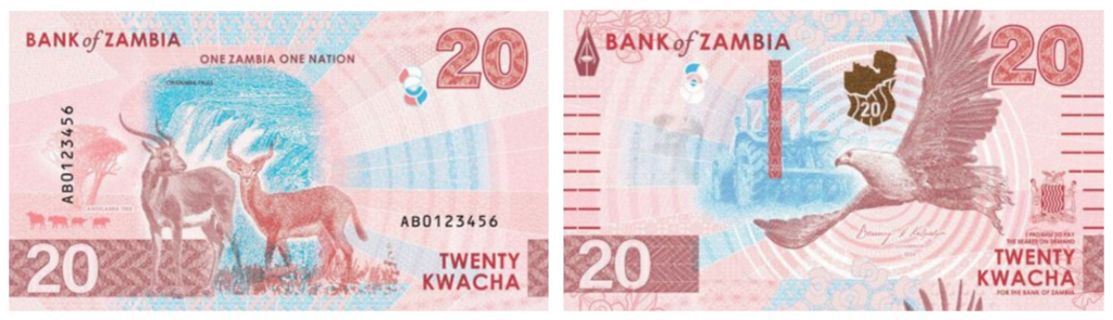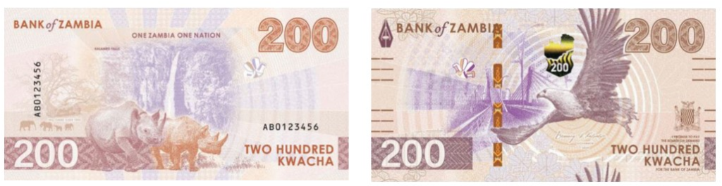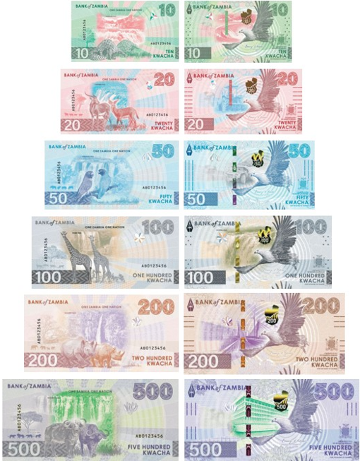 На лицевой стороне всех банкнот изображён африканский орлан-крикун — символ гордости и единства Замбии.В фоновом оформлении представлены ключевые экономические отрасли страны: сельское хозяйство, туризм, добыча полезных ископаемых.