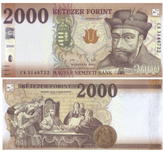 Основные изменения: новые подписи (Patai, Varga, Virág) и дата 2025 года. Дизайн с портретом Габора Бетлена и историческими сценами остался без изменений.