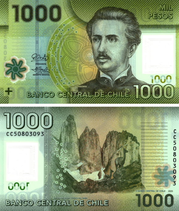 Банк Чили сообщил о выпуске банкноты номиналом 1000 песо с новыми подписями (Costa, Herrera) и датой 2025 года.
