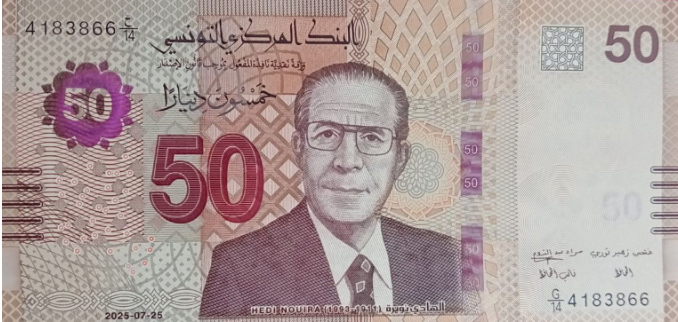 Центральный банк Туниса сообщил о выпуске банкноты 50 динаров с датой 25 июля 2025 года.