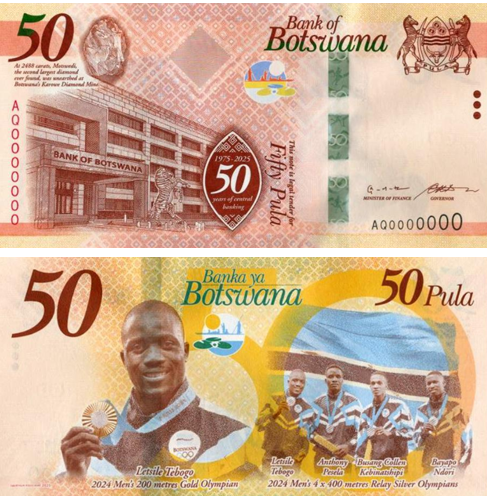 С 6 февраля 2026 года Bank of Botswana вводит в обращение памятную банкноту номиналом 50 пула, анонсированную в сентябре 2025 года президентом Duma Gideon Boko. Выпуск приурочен к 75-летию Банка Ботсваны и одновременно посвящён успехам страны на Олимпийских играх 2024 года в Париже.