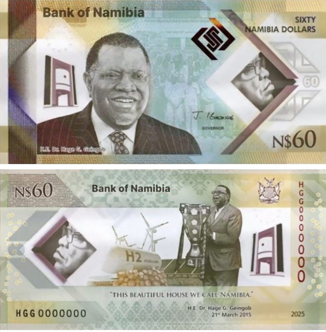 Исключительный дизайнНа передней стороне банкноты изображён портрет доктора Гейнгоба в прозрачном окне, что подчёркивает его влияние на историю Намибии.