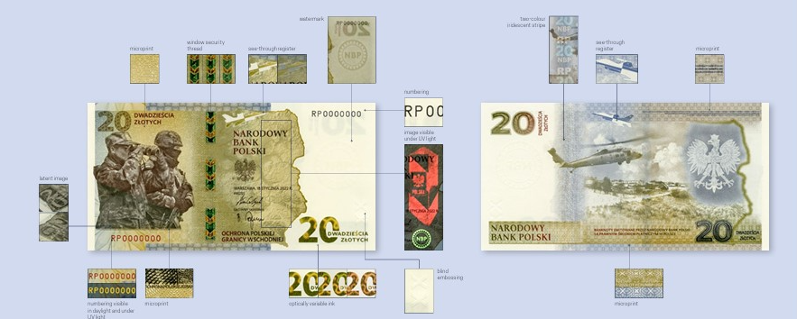 Именно PWPW S.A. занимается изготовлением всех памятных банкнот, выпускаемых по заказу Narodowy Bank Polski (NBP). Типография применяет самые современные технологии защиты: водяные знаки, защитные нити, микропечать, ультрафиолетовые элементы, а также офсетную, глубинную и голографическую печать.