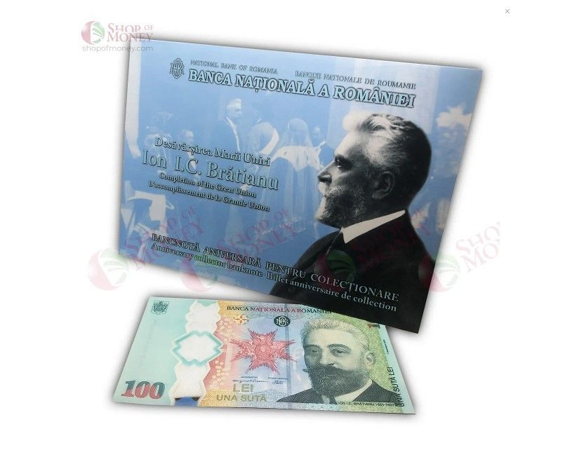 Великая Уния 1918 года ознаменовала объединение Трансильвании, Бессарабии и Буковины с Румынией. На банкноте изображён Ион И. К. Брэтиану — премьер-министр, сыгравший решающую роль в этих событиях.