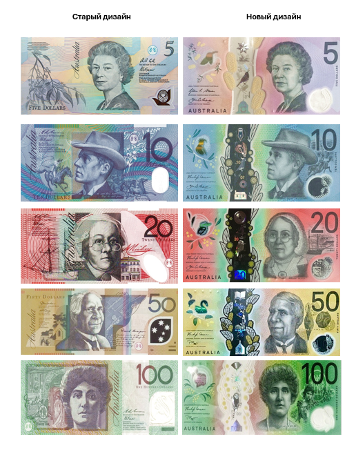 - Особенность дизайна – Портрет королевы на банкнотах Австралии менялся, отражая её возраст и статус. При этом неизменным оставалось её центральное место в дизайне.