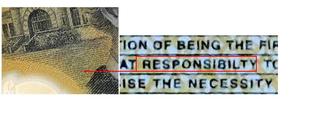 Одна из самых известных ошибок на полимерных банкнотах Австралии была допущена на купюре 50 долларов образца 2018 года. На обратной стороне банкноты содержится цитата Эдит Коуэн, первой женщины-депутата парламента Австралии. В слове "responsibility" (ответственность) была допущена ошибка – оно было напечатано как "responsibilty", без одной буквы "i".