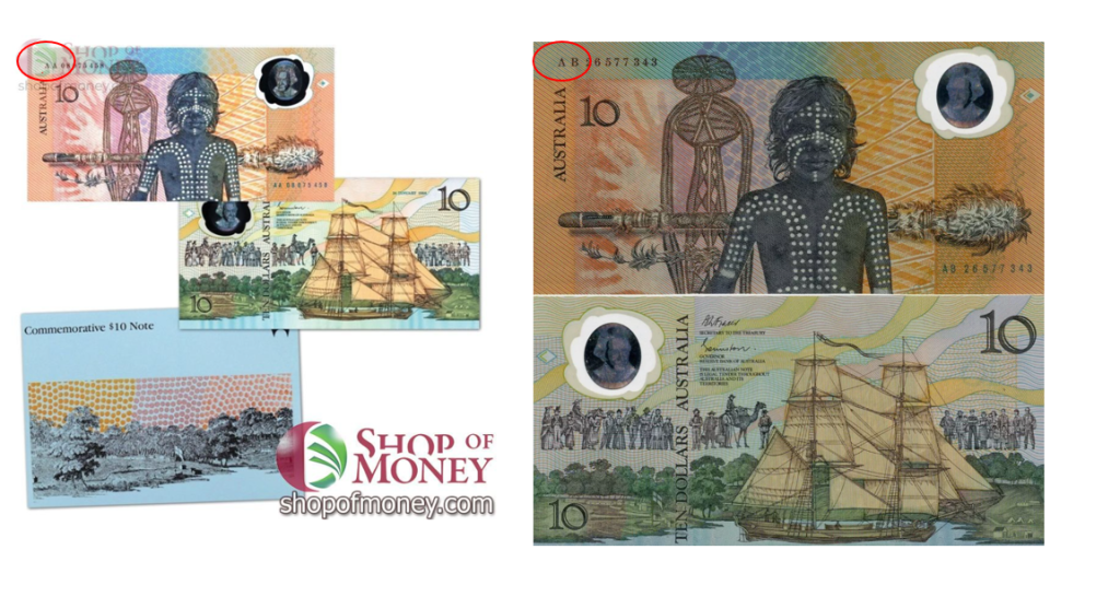 - Дизайн: Купюра была посвящена 200-летию основания Австралии. На лицевой стороне изображён капитан Артур Филлип, а на обороте – абориген и традиционные элементы культуры Австралии.