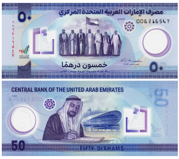 В 2021 году Центральный банк выпустил памятную полимерную банкноту номиналом 50 дирхамов, посвящённую 50-летию образования государства.